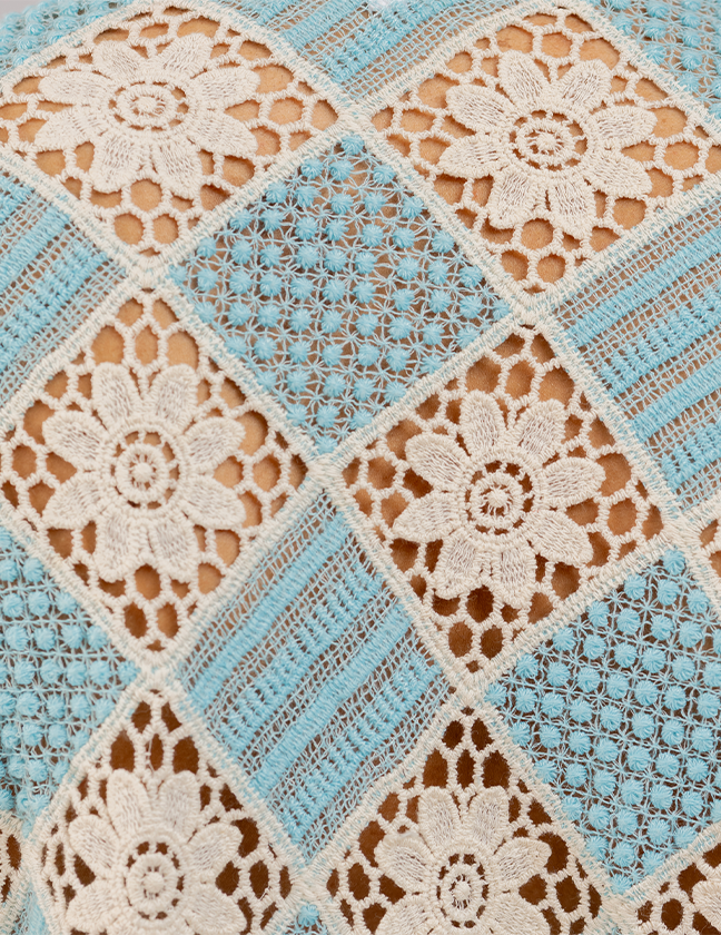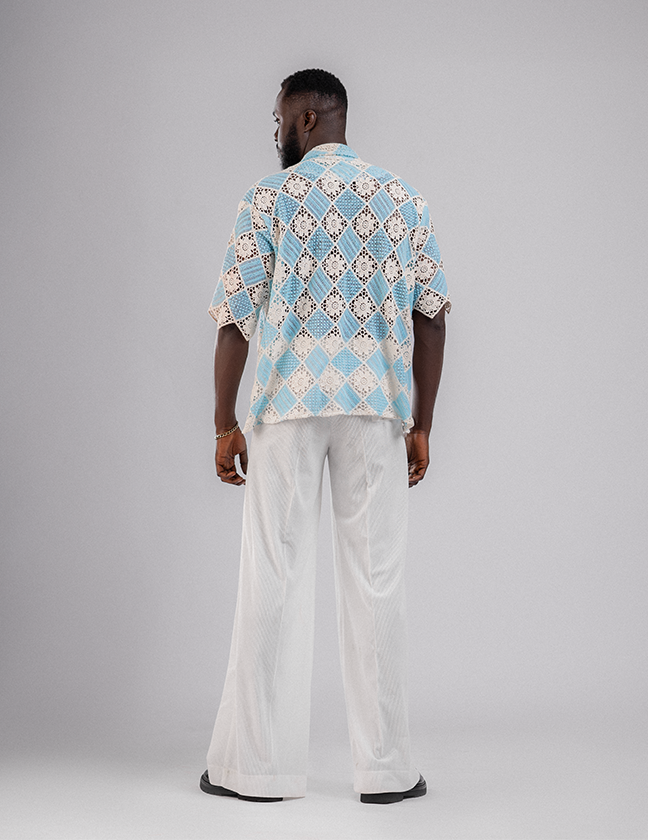 A statement crochet shirt in white and sky blue, blending artisanal craft with modern masculinity. Light, breathable, and effortlessly stylish.